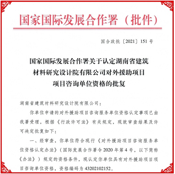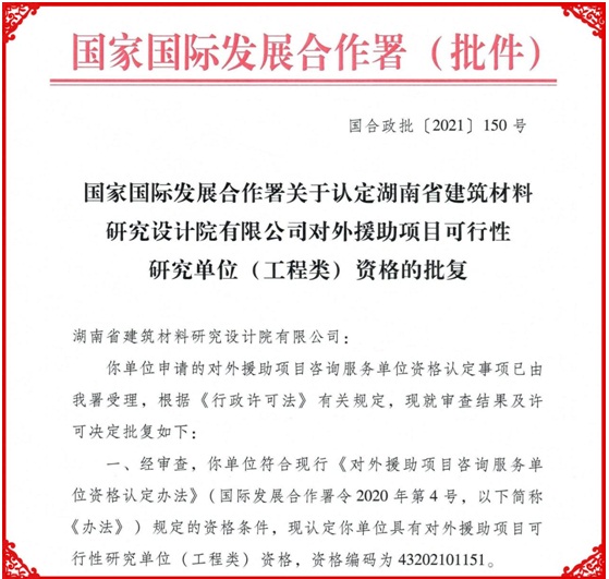 近日,在國家國際發(fā)展合作署開展的對外援助項(xiàng)目咨詢服務(wù)單位資格認(rèn)定中,HNBMI成功獲批了對外援助項(xiàng)目可行性研究單位(工程類)、項(xiàng)目咨詢單位兩項(xiàng)資格。