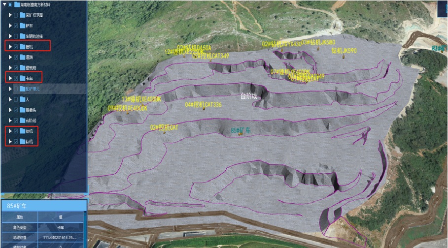 三維管控平臺(tái)可以形象的展示采礦場(chǎng)現(xiàn)狀情況,采礦場(chǎng)現(xiàn)狀是車輛運(yùn)行正常顯示的基礎(chǔ),一般隨著生產(chǎn)的進(jìn)行,導(dǎo)致采礦場(chǎng)發(fā)生較大的變動(dòng)后,就需要更新采礦場(chǎng)現(xiàn)狀,更新采礦場(chǎng)模型是在數(shù)字采礦軟件平臺(tái)中進(jìn)行操作,三維管控平臺(tái)會(huì)自動(dòng)讀取數(shù)據(jù)進(jìn)行更新;還有車輛運(yùn)行現(xiàn)狀,對(duì)卡車進(jìn)行定位管理系統(tǒng),在露天礦復(fù)雜的生產(chǎn)作業(yè)環(huán)境下建立礦山生產(chǎn)車輛的安全管理系統(tǒng)。實(shí)現(xiàn)對(duì)卡車、挖機(jī)等設(shè)備的位置的實(shí)時(shí)跟蹤、顯示,提高生產(chǎn)過程的可視化管理,實(shí)現(xiàn)車輛安全管理,對(duì)超速、越界等違章駕駛行為進(jìn)行有效監(jiān)管;還通過無線傳輸技術(shù)對(duì)進(jìn)入礦區(qū)現(xiàn)場(chǎng)的人員佩戴智能安全帽,對(duì)露天區(qū)域人員進(jìn)行精準(zhǔn)定位,實(shí)時(shí)自動(dòng)跟蹤,當(dāng)與車輛過度接近時(shí)自動(dòng)播放報(bào)警語音,后臺(tái)監(jiān)管人員可隨時(shí)掌握每名進(jìn)入礦區(qū)現(xiàn)場(chǎng)員工的位置及活動(dòng)軌跡、作業(yè)區(qū)域人員的位置分布,從而對(duì)一線人員安全進(jìn)行有效的監(jiān)管。